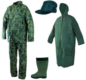 Дъждобрани, маскировъчни дрехи, гумени ботуши, шапки и друга екипировка за риболовци и ловци